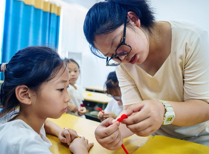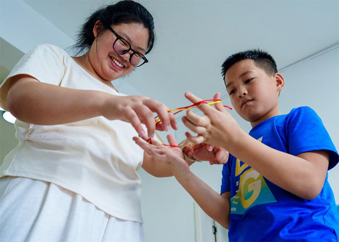 图为实践团成员毛颖悦在课后和小朋友们翻花绳