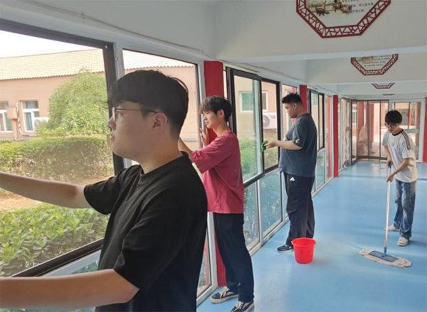在活动中,实践团成员首先对养老院环境进行整理与清洁。走廊里,几名青年分工协作,有的擦拭窗户玻璃,有的清洁地面,确保室内环境整洁明亮,为老人们营造舒适的居住氛围。细致的劳动不仅改善了院内环境,也让长者们感受到实实在在的用心关怀。