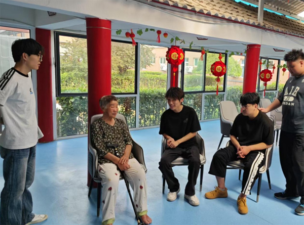 除了环境整理,实践团成员还走进老人中间进行交流。在一处活动室内,几位成员围坐在老人身旁,认真倾听她的生活故事,不时与之互动交谈,气氛轻松而温馨。老人脸上洋溢着笑容,显得格外亲切,现场呈现出一幅其乐融融的画面。