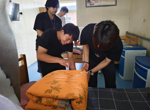 在生活服务方面,成员们走进老人房间,主动帮助整理床铺,折叠被褥。面对厚重的棉被,志愿者们配合默契,动作熟练,展现出责任感与细心。他们用耐心完成每一次整理,让老人的居住环境更加整洁舒适。