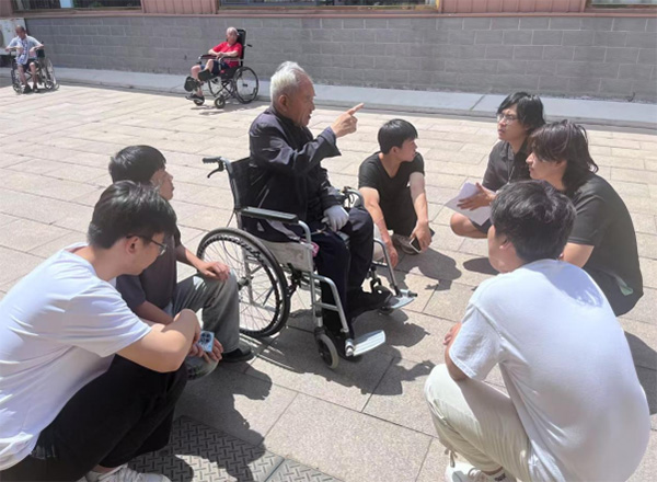 情感交流环节中,几位成员围坐在院子里,专心聆听坐在轮椅上的老人讲述过往经历。老人用手指着远方,分享记忆中的点滴,而志愿者们则一边记录一边互动交流。这一幕拉近了彼此之间的距离,也让老人感受到陪伴的温情。