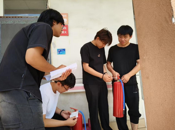 除了日常照护,安全教育同样是实践的重要组成部分。实践团成员还协助检查并学习使用灭火器,认真研究操作步骤,逐一进行实际操作,确保养老院的消防设备能在紧急情况下发挥作用。此举进一步增强了养老院的安全保障。