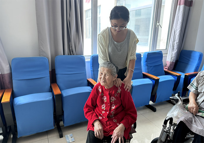成员们为老人提供了贴心的按摩服务。他们根据事先学习的按摩手法,帮助老人缓解肩颈酸痛,传授给老人们一些养老保健的小知识。
