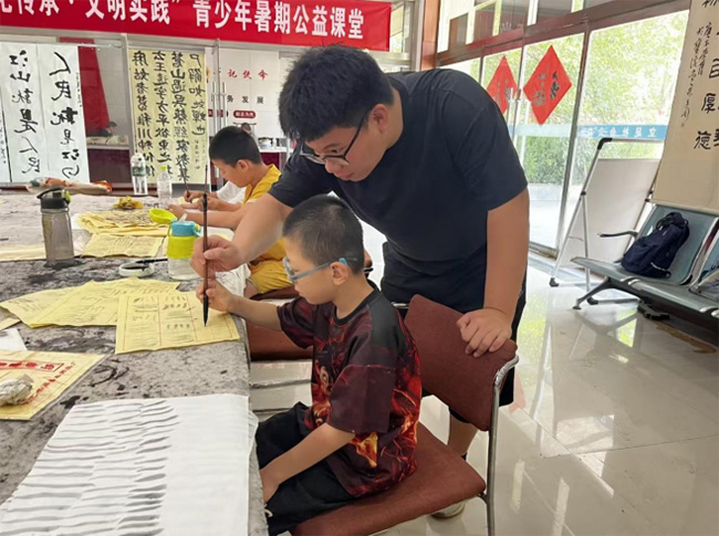 除课堂与参观外,书法教学也是此次实践的重要环节。实践团成员在九户镇公共文化服务中心耐心指导孩子们书写毛笔字,手把手教授执笔与运笔的方法。孩子们在练习中表现出极大兴趣,不仅初步掌握了书写技巧,也体会到传统书法的独特魅力。