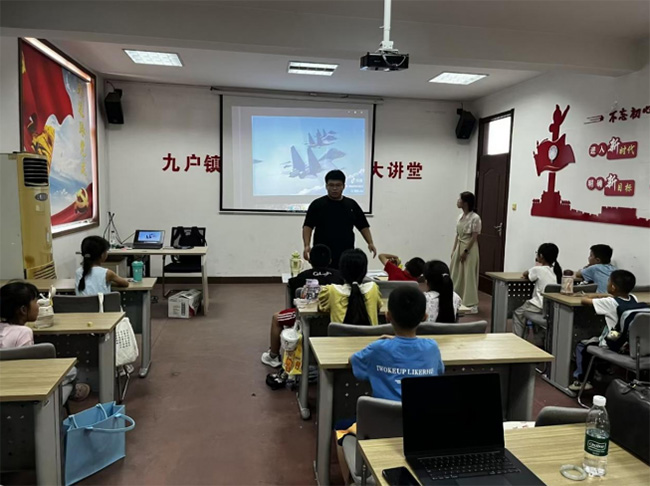 在九户镇新时代大讲堂里,实践团成员面向镇内儿童播放军事题材影像资料,并结合图像进行讲解。课堂氛围活跃,孩子们一边专注聆听,一边积极发问,课堂不仅传递了爱国情怀,也让孩子们在暑期中收获了新知识。