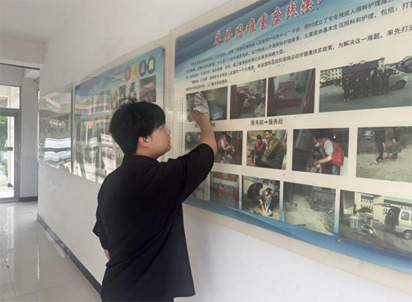 在敬老院的走廊里,志愿者认真擦拭宣传栏,确保墙面上的公益展示内容整洁清晰,让来往人员能够更直观地了解院内的服务信息和社会关怀举措。这一细致的举动不仅保持了环境整洁,也营造了更加温馨的氛围。