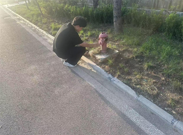实践团成员还对院区的安全设施进行检查。在傍晚的阳光下,志愿者蹲下身来仔细查看室外的消防栓,确认其是否能正常使用,进一步提升了敬老院的安全保障水平。