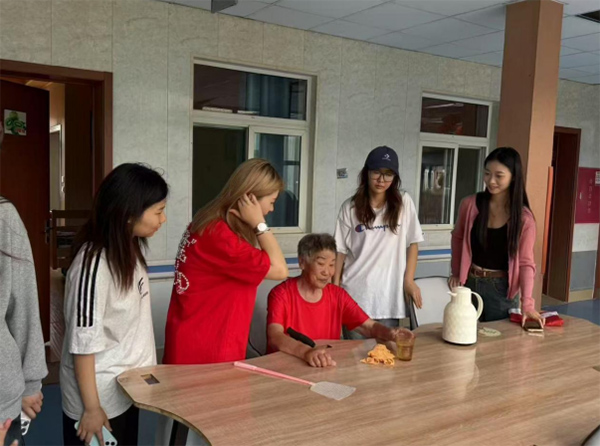 在养老院内,实践团成员走进老人身边,主动承担起陪伴与照料的任务。志愿者们为老人们端水、分发饮品,与他们拉家常,让院内的氛围温馨而热络。几位老人坐在餐桌旁,手中捧着热茶,身边环绕着青春的面孔,神情间洋溢着安心与喜悦。