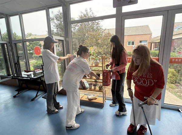 除了日常陪伴,实践团还积极参与院内环境整理工作。在书屋区域,志愿者们分工协作,有的擦拭书架,有的整理图书,有的打扫地面,将空间收拾得整洁有序。窗外阳光透过玻璃洒进来,映照着他们忙碌的身影,也让整个活动室焕发出新的活力。