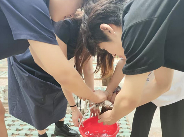 图为“苍柏行”实践团成员拎水清理环境