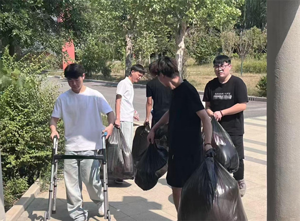 实践活动伊始,实践团在养老中心大厅开展了环境清扫工作。成员手持扫帚、簸箕,清理地面尘土、擦拭桌椅,将公共区域打扫得干净整洁,营造舒适氛围。随后,志愿者将卫生死角的生活垃圾集中分类,对黑色垃圾袋进行搬运处置,展现了责任担当。
