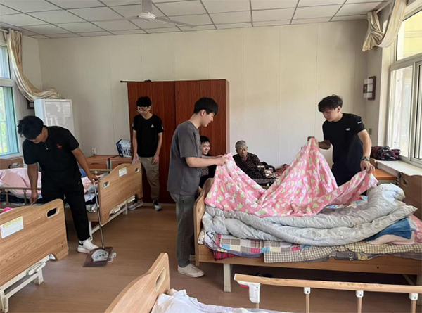 在老人房间内,成员们协作整理床铺、清扫地面。一位长者静静地坐在床边,目光温和地注视着年轻人熟练地铺好粉色床单。另一名成员弯腰清理角落的灰尘,确保环境整洁舒适。每一个细节都体现出他们对老人生活的细致照顾。