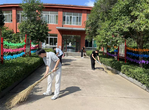 在清晨明亮的阳光下,成员们拿起扫帚,在养老中心的主干道上清理落叶与杂物。两旁的彩色风车在微风中旋转,映衬着年轻身影的忙碌。干净整洁的环境不仅让老人们心情舒畅,也为养老中心营造了温馨宜人的氛围。成员们分工明确,有的专注清扫角落,有的处理堆积的落叶,整个过程有条不紊,体现了高度的责任感。