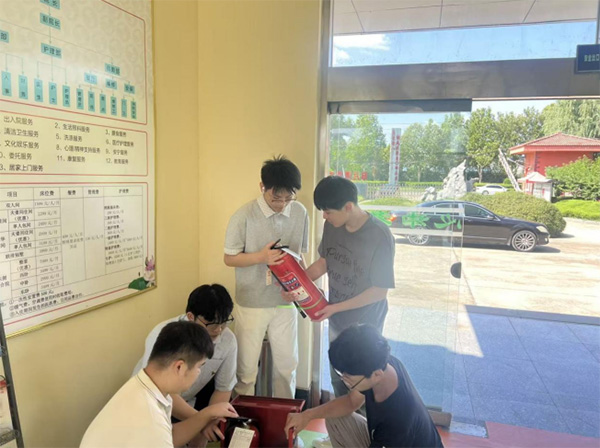 实践团成员抵达养老中心后,第一时间对消防器材进行检查和学习,他们围坐在入口处,认真讨论灭火器的使用方法,确保在突发情况下能够及时应对。这一细致的准备工作不仅保障了养老中心的安全,也为后续活动的顺利开展奠定了基础。