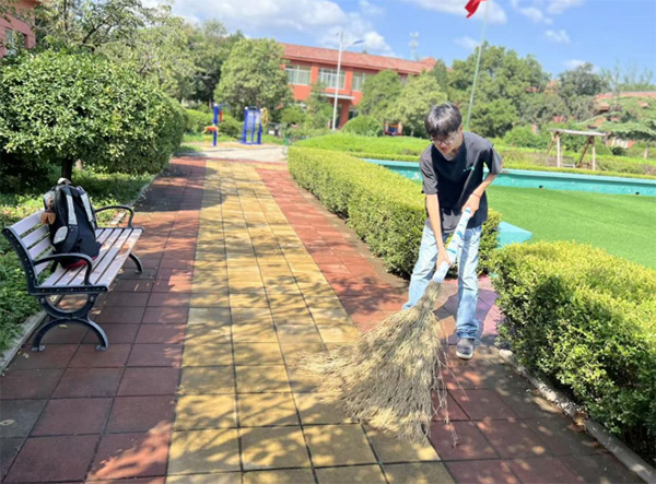 在中心的户外区域,实践团成员手持扫帚清理园区小道,耐心打扫落叶与尘土,让原本静谧的环境焕发出整洁的光彩。阳光映照下的干净小径,不仅提升了中心的整体氛围,也为老人们提供了舒适安全的活动空间。
