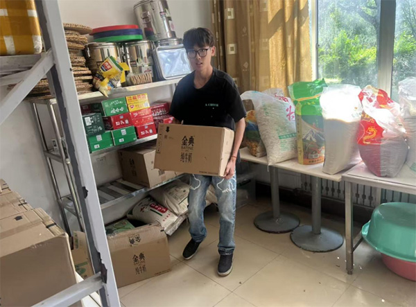 实践团成员为老人们带去日常食品物资,进入储藏室牛奶日用物资逐一搬运、分类、整齐摆放。他们小心翼翼地搬动沉重的箱子,确保物资在分发时方便取用。这一细致的工作不仅保障了养老中心日常供应的有序,也让老人们的生活更加舒适。