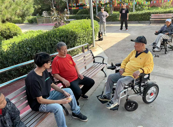 交流陪伴是此次实践的另一重点。实践团成员在长椅旁与老人促膝交谈,耐心倾听他们的生活故事。庭院内,几位坐在轮椅上的老人面带笑容,与年轻人分享过往经历,气氛轻松而温暖。