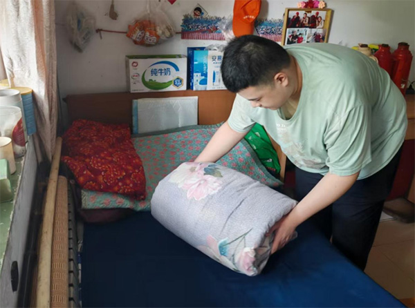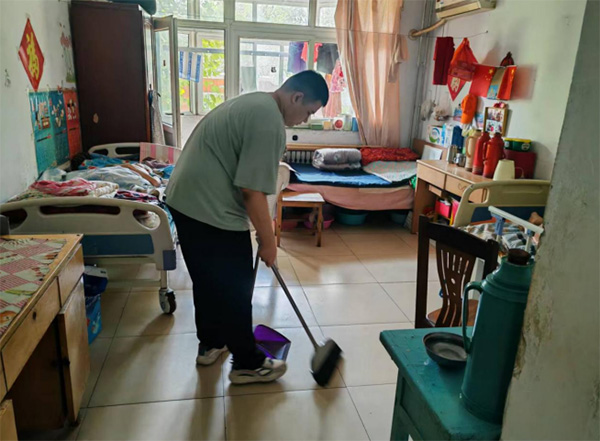 在养老中心的居室中,实践团成员俯身打扫房间,仔细将地面清扫干净,确保每一个角落都整洁舒适。床铺凌乱时,实践团成员轻轻整理被褥,让房间重新焕发温馨气息。这一细致的劳动不仅改善了老人的居住环境,也让老人们感受到家的温暖。