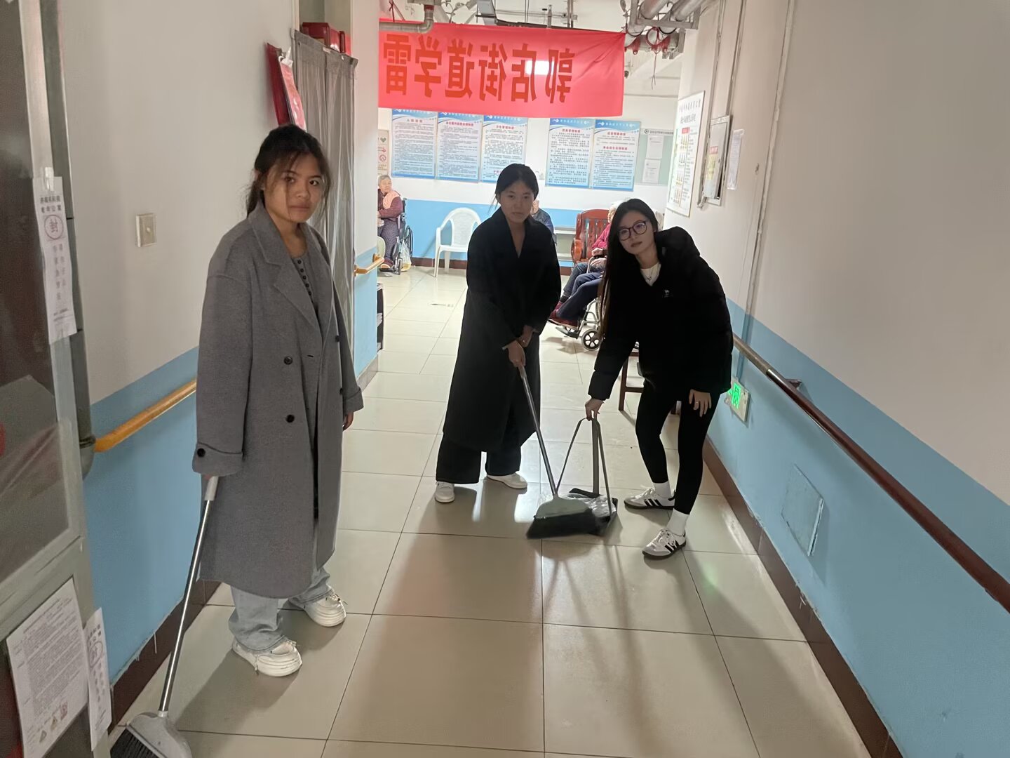 福寿养老院共有32位常住老人,院内公共活动区域堆满落叶,部分老人房间因日常使用积累了灰尘,走廊角落及窗台缝隙易被忽略。实践团抵达后,先与养老院负责人张阿姨沟通了解清洁重点区域,随后分组分工:6名同学三人一组拿起工具清扫院内落叶、垃圾;随后,进入房间,轻扫地面、擦拭床头柜与窗台以及走廊扶手,过程中全程保持轻声细语,避免打扰老人休息。