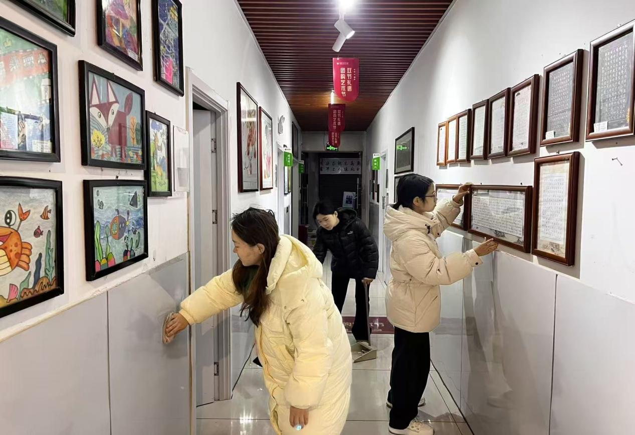 天一教育是当地一所面向小学初中高中的艺术培训机构 因缺乏专业保洁人员 教师和活动区域的卫生条件有待改善 实践团抵达后 首先与机构负责人对接 了解卫生痛点和清洁需求 成员们迅速分组6名同学三人一组 一组负责擦拭教室桌子 扫地 摆放凳子 另一组则对教室外擦拭墙壁 清扫走廊 整理墙壁挂画 为了不影响孩子们正常上课 所有清洁工作都利用课间时间完成