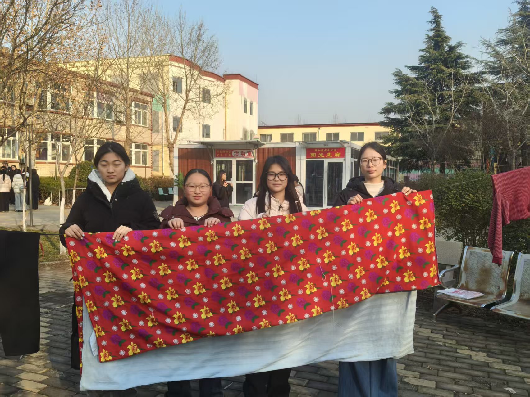 打扫过程中,实践团成员对老人的衣物,被褥等物品进行了摆放并发现有些老人的被子潮湿,便将被子进行了整理并拿出去进行晾晒。随后,发现户外活动室的玻璃上有污渍,实践团成员便用清洁布进行擦拭。