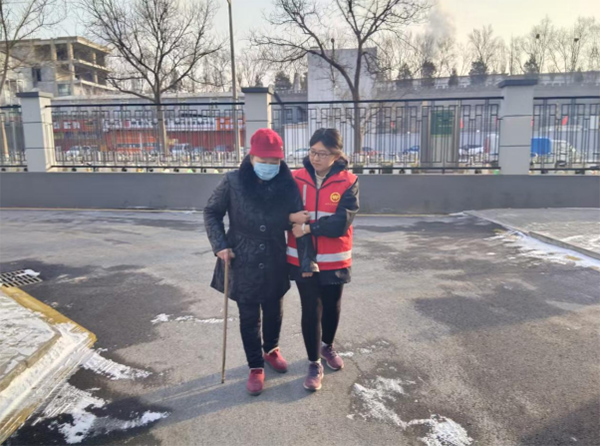 室外道路结冰的时段,志愿者搀扶使用拐杖的老人缓慢通行,在院内路口与台阶处提醒注意脚下湿滑,并将老人安全送至活动点。