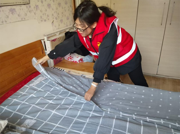 在一户老人家中,志愿者俯身整理床铺、抚平被角,将褶皱床单重新铺展,确保老人起居安全整洁。随后,志愿者对房间地面、桌面和公共区域进行打扫,清理杂物与积尘,补齐常用物品摆放位置,为行动不便的老人减少日常活动阻碍。