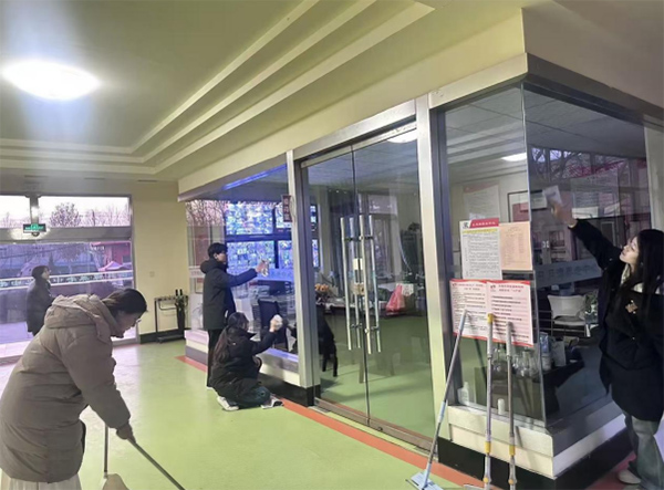 走进养老中心的大厅,成员们首先对公共区域进行整理与清洁。几人分工合作,有人拿着抹布擦拭玻璃门窗,有人俯身清理墙角与窗台上的灰尘,还有人拿起扫帚和拖把打扫地面。明亮的大厅在一遍遍擦拭与清扫后逐渐变得整洁有序,来往的老人不时停下脚步观看,有的还与成员简单交流几句。公共空间的整理让大厅恢复了干净的面貌,也为后续活动提供了良好的环境。