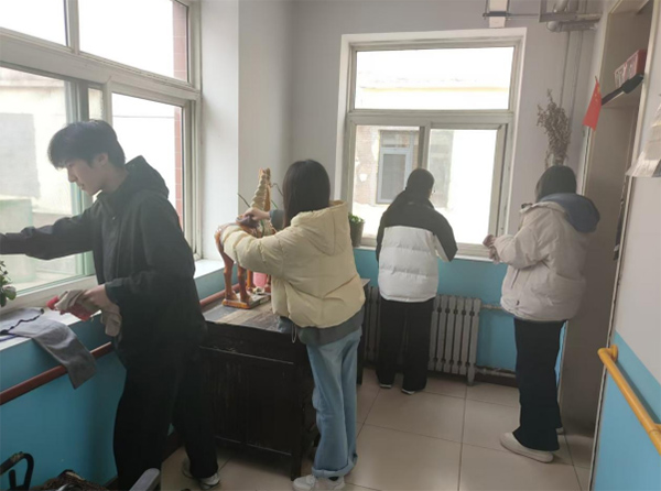 冬日的阳光透过走廊窗户洒进室内,几名实践团成员正在窗边擦拭玻璃和桌面。抹布在玻璃上来回移动,窗台上的灰尘被一点点清理干净,原本略显沉闷的房间逐渐变得明亮整洁。另一侧的房间里,成员们将摆放杂乱的物品重新归整,把公共区域的桌椅擦拭干净。经过整理后,窗台上的摆件重新摆放整齐,走廊环境也显得更加清爽。