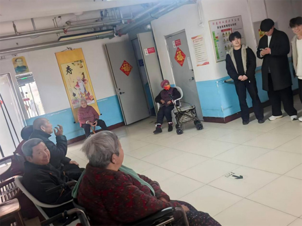 院区大厅逐渐热闹起来。几位老人围坐在一起,轮椅与长椅排成半圈。实践团成员站在一旁,准备着简单的节目表演。随着歌声响起,大厅里原本安静的氛围被打破,有老人抬头注视,也有人轻轻跟着节奏拍手。几名成员轮流表演节目,与老人进行互动交流,现场气氛渐渐活跃起来。