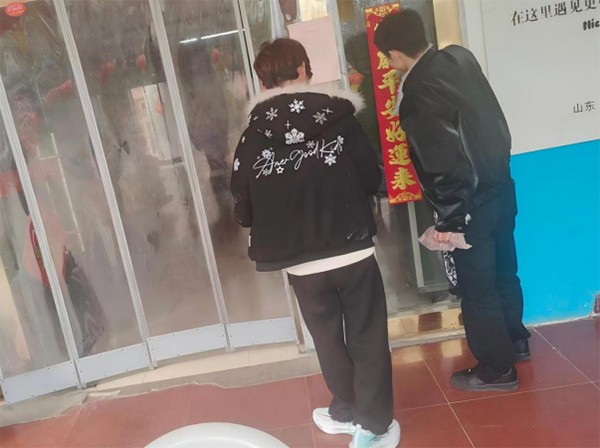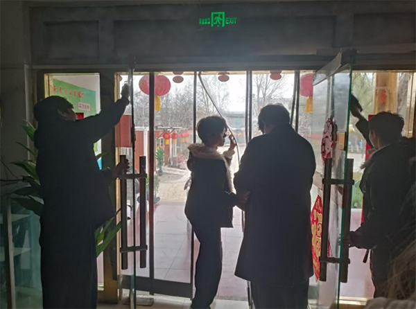 院区门口成为另一处忙碌的区域。成员们分工协作,将提前准备好的春联贴在门框两侧,红色的对联在冬日的光线下格外醒目。有人负责调整位置,有人用抹布擦拭门框表面,确保春联粘贴整齐。门口玻璃门上的装饰也被重新整理,灯笼与年节装饰在入口处形成了一道醒目的红色景象。