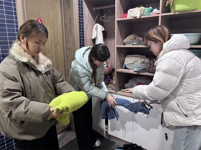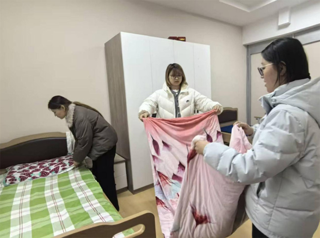 除了陪伴交流,实践团成员还参与整理居住环境。储物柜前,几名成员将衣物逐件叠好放回格子中,毛巾与被褥被重新分类摆放。另一间房间里,成员们配合着铺床整理床单,将被褥铺平并检查床铺周围的物品摆放情况。整个过程中,大家分工协作,使房间逐渐恢复整洁有序。