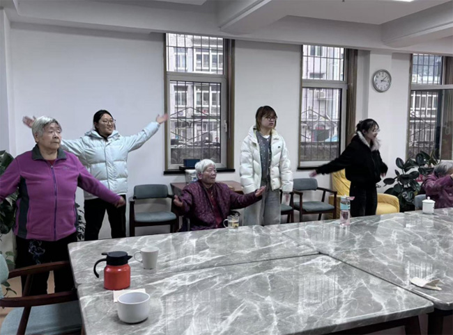 在公共活动区域,成员们与老人一起进行简单的肢体活动。随着动作示范,几位老人坐在椅子上缓慢抬起手臂、舒展身体,实践团成员在旁协助动作节奏。活动室的窗外透进冬日的光线,老人们跟随节奏做着伸展动作,现场气氛轻松而有序。