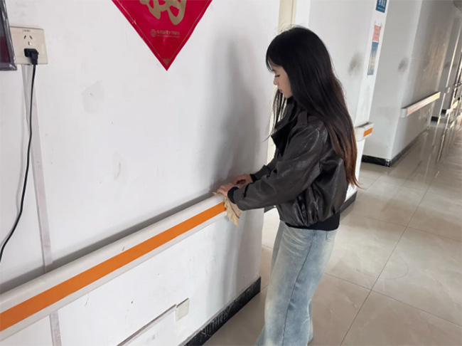 为给老人们营造更加整洁、舒适的居住环境,志愿者化身“环境守护者”,全面开展颐养院环境整治工作。在走廊区域,志愿者手持抹布,细致擦拭扶手污渍,不放过任何一处角落。