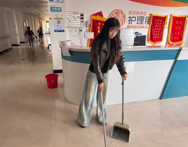 卫生清扫:志愿者手持扫帚与簸箕,细致清扫地面,用劳动守护院区整洁。