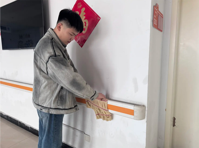 为给老人们打造干净舒适的生活空间,志愿者化身“清洁卫士”,积极投身院区环境整治。大家分工协作,有的手持抹布仔细擦拭走廊扶手、窗台,清除污渍与灰尘。