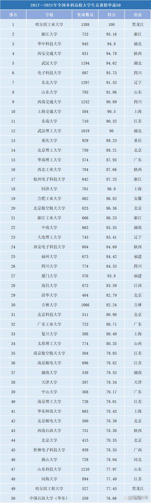 竞赛成果在一定程度上反映出学校的教育水平和人才培养质量。大学生参与各类竞赛不仅有助于提升创新意识、实践能力,同时也是展示学校教学质量和综合实力的一张最好的名片。近日,中国高等教育学会发布了2017—2021年全国本科院校大学生竞赛榜单,下面就来看看都有哪些高校进入前50强。