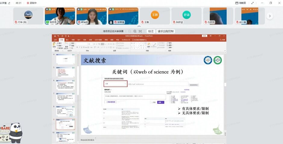 9月29日,为加强学生检索文献、文献阅读能力,提升学生专业认知度和认可度,依循发挥“党建+专业”的工作思路,由电子科技大学研究生党建委员会主办、生命学院研究生党建委员会承办的“文献查阅经验分享报告会”于“飞书”平台线上举办成功。本次报告会邀请到电子科技大学资深博士后蒋思思为各位“科研新手”带来多方面的科研技能分享,目的是帮助同学在专业文献检索、科研计划、科研分析、科研技能、整理成果能力方面有所提升,更加适应研究生涯。