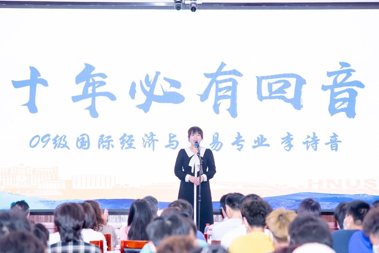 十年必有回音 “既然生逢盛世,必要不负盛世。”09级国际经济与贸易专业李诗音是潇湘学院独立管理后的第一批学生、第一任院团委副书记,更是潇湘毕业学子中第一个女博士。心有多坚定,发展的舞台就有多宽广,从班长到军训负责人到助班再到院团委副书记,她在苦干实干中攻城拔寨,乐观自信是她一路向前的不二法门,奋进拼搏的人生态度让她在后来的硕士与博士生涯中收获满满。工作后,她在教授知识的同时传递着正能量,助力更多学生插上梦想的翅膀,飞向更美好的未来。她是追风赶月的潇湘人,始终怀感恩之心,不忘过往,带着潇湘精神在学术道路上一往无前。千帆过尽,当她再次站到潇湘学院的舞台上,她依然是那个能力超群的潇湘大师姐,也是“战功赫赫”的潇湘人。