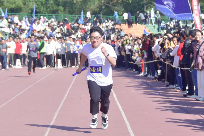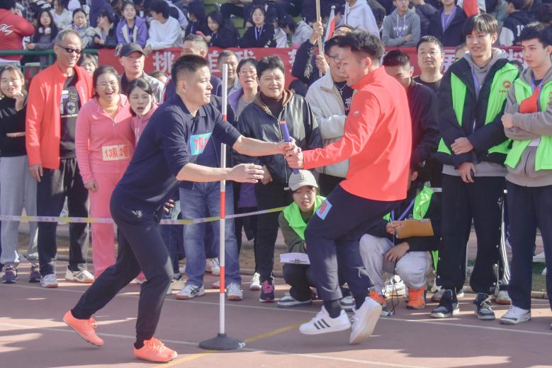 接力传递勇气,团魂凝聚力量。教职工100米*30人往返接力赛于9:45激烈开赛。鼓声、掌声、欢呼声充斥整个田径场,观众们热情高涨,老师们也在跑道上摩拳擦掌、积极热身。一声哨响,各学院第一棒参赛队员们如离弦之箭飞奔而出,后续接力的老师们作预备姿态,左手举在半空时刻准备接棒。在后三棒冲刺阶段,商学院的老师们和体育学院的老师们大跨步飞奔,最终共同位列第一。
