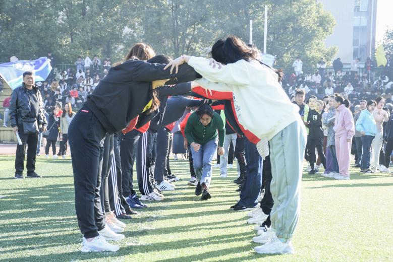 紧接着,“同心协力”比赛正式开始。各学院参赛队伍以“十人十一足”形式参加比赛。“一、二!一、二!”伴随整齐划一的口号,各队伍参赛队员手臂交叠、互相搀扶,齐步迈近终点。有人摔倒,便互相搀扶;稍有落后,立即加快步伐……田径场上,观众们为老师的助威、呐喊声此起彼伏,现场气氛热烈非凡。最终,土木工程学院拔得头筹,商学院、资源环境与安全工程学院紧随其后。