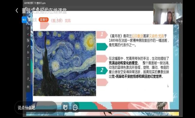 一.课程教学 早上8点40左右,上第一节课的老师就已经准备就绪,等待孩子们进入课堂。8点50分,第一堂课正式开始。一班老师张培以“关注口腔健康”为主题授课,通过动画人物增强课程的趣味性与可接受度,小朋友们也非常配合,积极互动,认真听讲;与此同时,二班老师江卓然为小朋友们讲解八音里的丝、竹,课堂轻松,气氛活跃,老师化繁为简,把抽象的知识讲解的通俗易懂小朋友们也非常感兴趣。之后,上午的第二节课开展,一班的董佳文老师讲解美术鉴赏,介绍用不同形状的点、线组合成的作品的独特魅力,从生活中的各种形状中发现美,并介绍了梵高的作品《星月夜》,从色彩、笔法、物象等方面分析了画中传达的情感,同时也展示了莫奈的《日出·印象》,从多种角度欣赏印象画的独特之处。二班的丁玉珂老师带领孩子们感受音乐的魅力,用《送别》结束课堂 ,希望孩子们记住这个冬天,“志当存高远”。