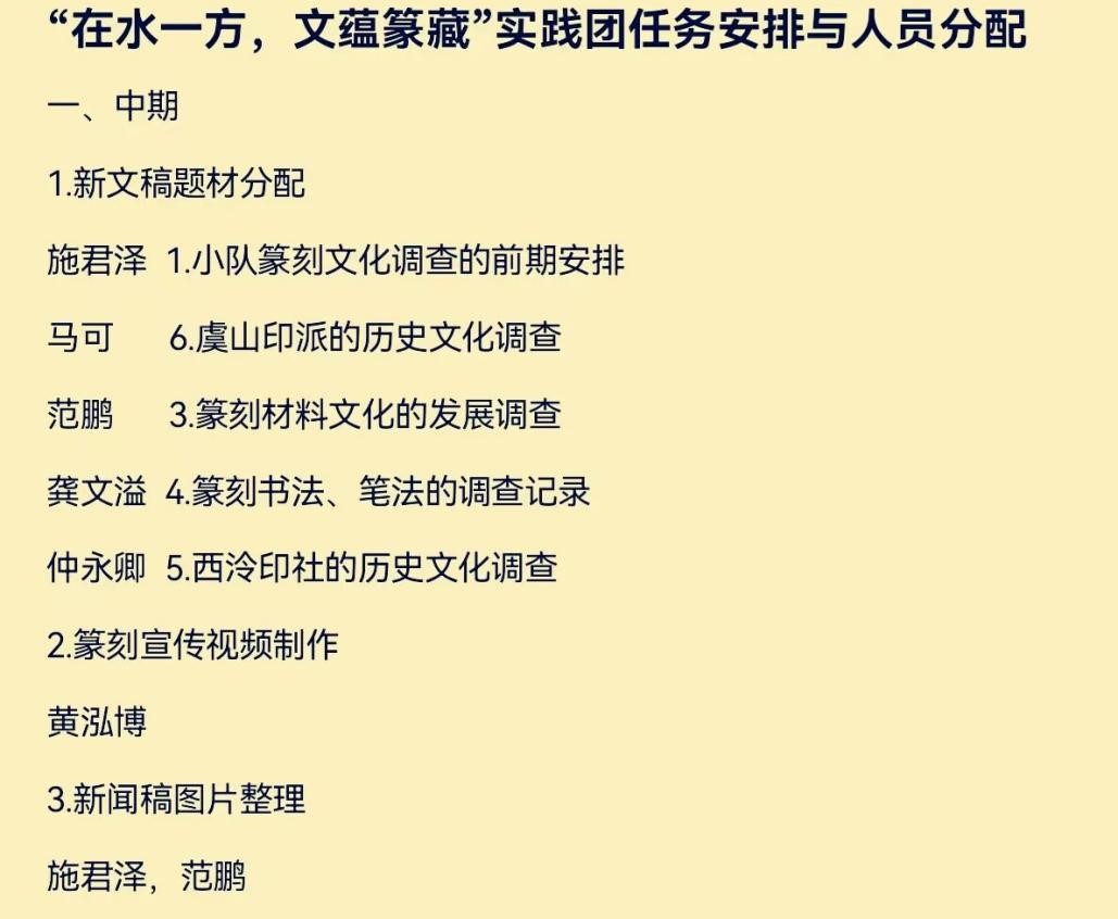 团队也做了任务分配与时间规划,从新闻稿的分块撰写到刻章实践在互联网上的视频宣传,团队成员争取一个更加全面丰富的方式来展现小队实践的成果,让更多人更好地了解篆刻艺术的魅力。