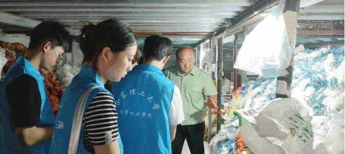 图为村委书记李从吉带领实践团成员参观渔网加工现场